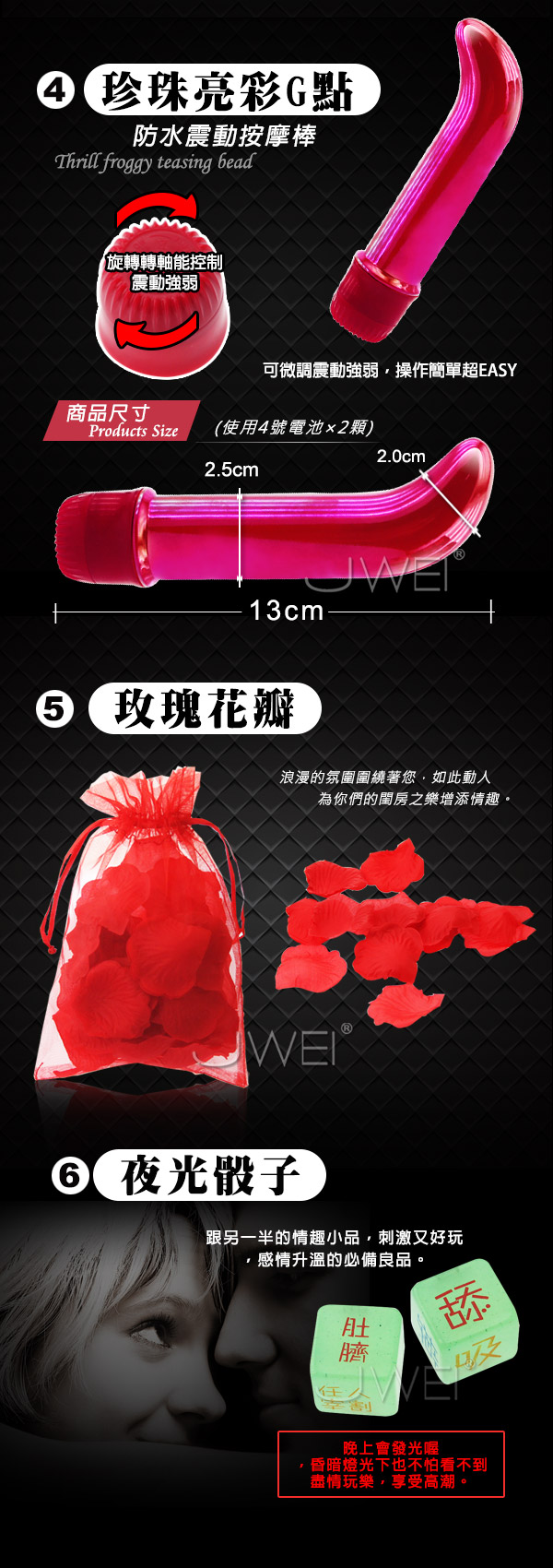 用途:男女情趣之用 材質:矽膠+塑膠 規格:電壓1.5v震動/10頻 電源:LR44水銀電池x3顆 淨重:約100g 總重:約140g 尺寸:全長約12.3cm 可.....